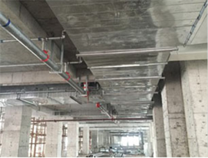 所有安裝在吊頂內(nèi)的排煙管道均采用不燃材料包裹,并與可燃物的距離不小于150mm,空調(diào)通風管道穿越防火區(qū)時用不燃材料包裹。
